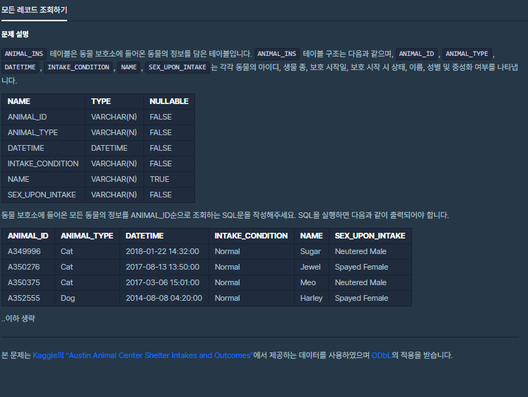 ANIMAL_INS 테이블은 동물 보호소에 들어온 동물의 정보를 담은 테이블입니다. ANIMAL_INS 테이블 구조는 다음과 같으며, ANIMAL_ID, ANIMAL_TYPE, DATETIME, INTAKE_CONDITION, NAME, SEX_UPON_INTAKE는 각각 동물의 아이디