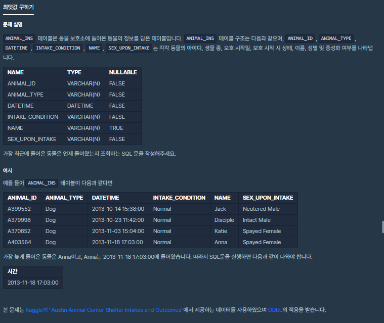 ANIMAL_INS 테이블은 동물 보호소에 들어온 동물의 정보를 담은 테이블입니다. ANIMAL_INS 테이블 구조는 다음과 같으며, ANIMAL_ID, ANIMAL_TYPE, DATETIME, INTAKE_CONDITION, NAME, SEX_UPON_INTAKE는 각각 동물의 아이디