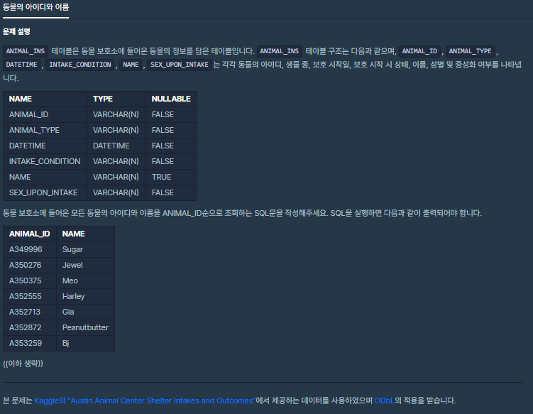 ANIMAL_INS 테이블은 동물 보호소에 들어온 동물의 정보를 담은 테이블입니다. ANIMAL_INS 테이블 구조는 다음과 같으며, ANIMAL_ID, ANIMAL_TYPE, DATETIME, INTAKE_CONDITION, NAME, SEX_UPON_INTAKE는 각각 동물의 아이디