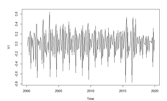 ACF가 첫 번째를 제외하고 대부분 0의 값을 취하는 것을 볼 수 있다.