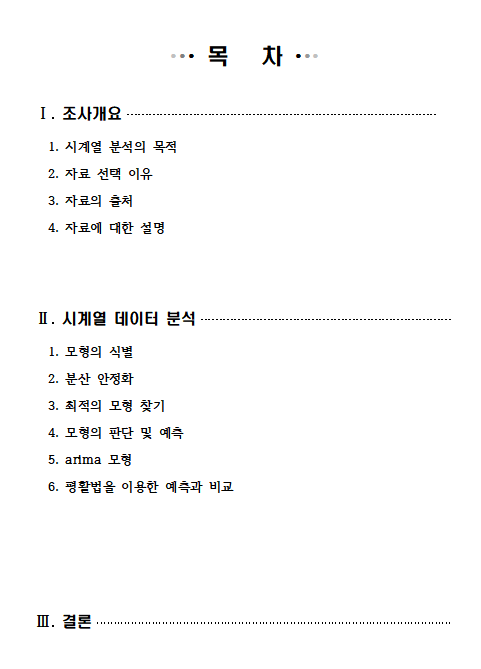Box-Jenkins 방법을 이용한 예측 모형을 만들거고 ARIMA모형과 평활법으로 예측한 모형과 비교하려고 한다.