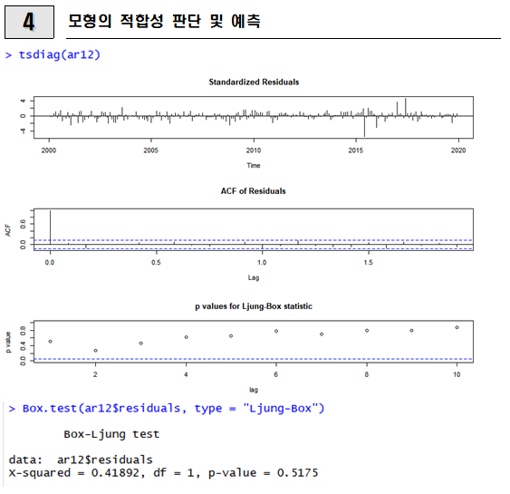 새로 적합된 모형의 잔차들은 자기 상관성을 보이지 않는다