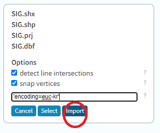 3.snap vertices를 체크하고 아래 옵션에서 'encoding=euc-kr'를 넣고 'Import'를 누릅니다.