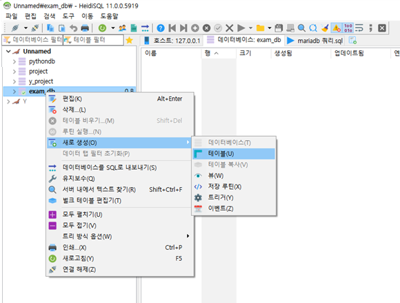 -새로 만든 exam_db를 마우스 우클릭한다음에 테이블을 만들어 줍니다