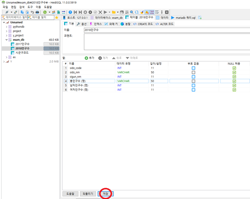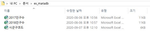 - 풀더안에 있는 csv형태와 똑같은 테이블을 만든 다음에 MariaDB를 이용하여 csv파일을 불러들어오려고 합니다.