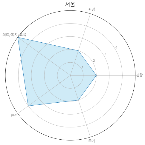 해당 인덱스에 있는 시군구 한 곳인 서울에 대해서 레이더차트를 그리고 각 피처들을 비교해보겠습니다.