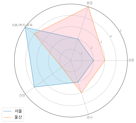 레이더차트에 서울과 울산을 그려 속성들을 비교해보겠습니다.