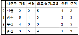 columns=['시군구', '관광', '환경', '의료/복지/교육', '안전', '주거'])