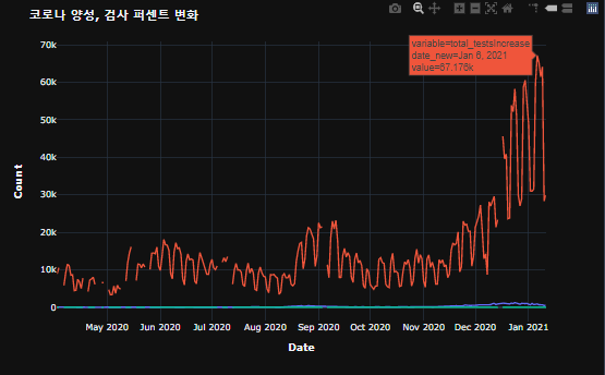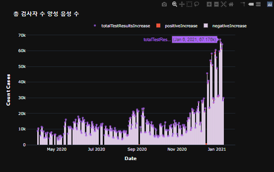 plotly를 이용한 2020.04 ~ 2021.01 까지의 한국 코로나 데이터 시각화를 하려고 합니다.