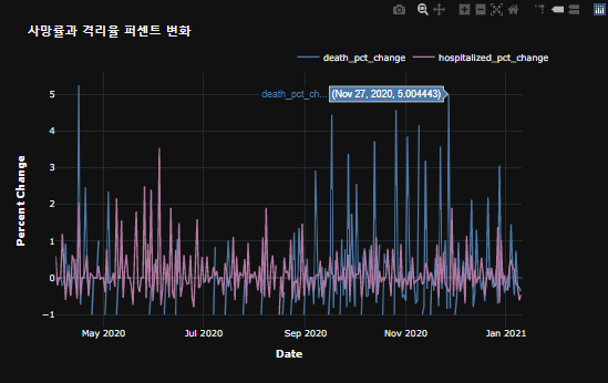 시간에 따른 사망률과 격리율에 대한 퍼센트변화를 시각화했습니다.