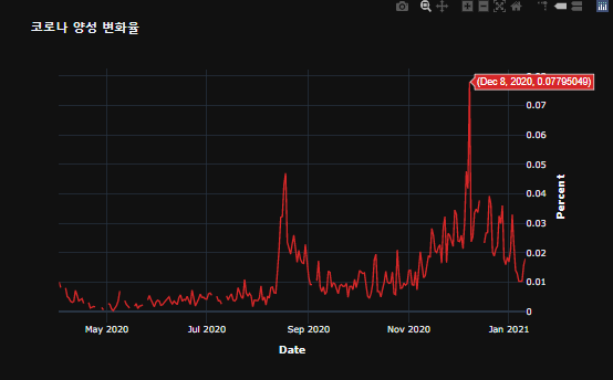 시간에 따른 코로나 양성 변화율을 시각화하였습니다.