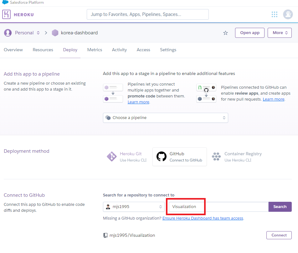 아래는 깃허브의 Repositories에서 구현시킬 dash가 있는 저장소를 찾아서 연결해줍니다.