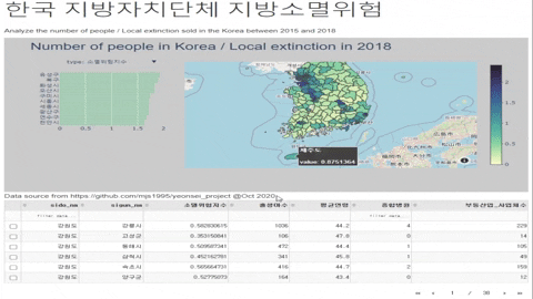 지도 시각화와 프로젝트 결과물을 토대로 한국지방소멸위험 대시보드를 제작하려고 합니다.