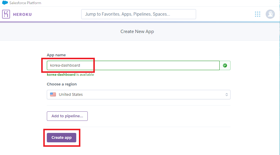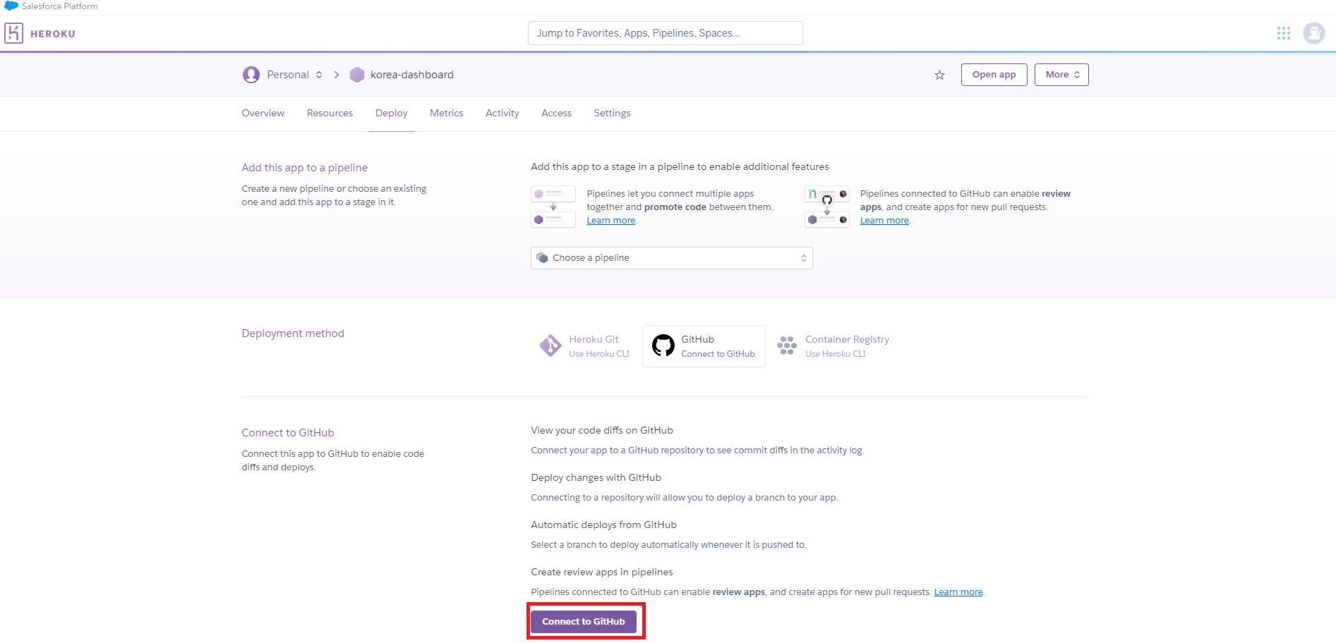 Deploy Branch를 눌러서 Heroku app을 만들어줍니다.