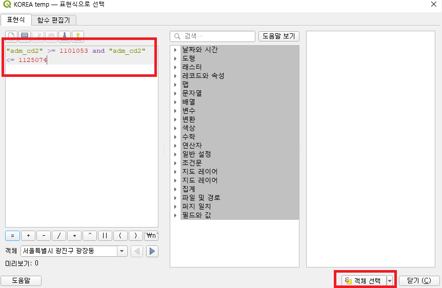 - 상단 메뉴에서 표현식을 이용해 객체 선택을 선택한 다음에 아래의 코드를 표현식에 넣어줍니다.