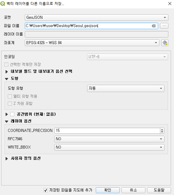 - GeoJson 파일 형태로 원하는 위치에 저장해줍니다.