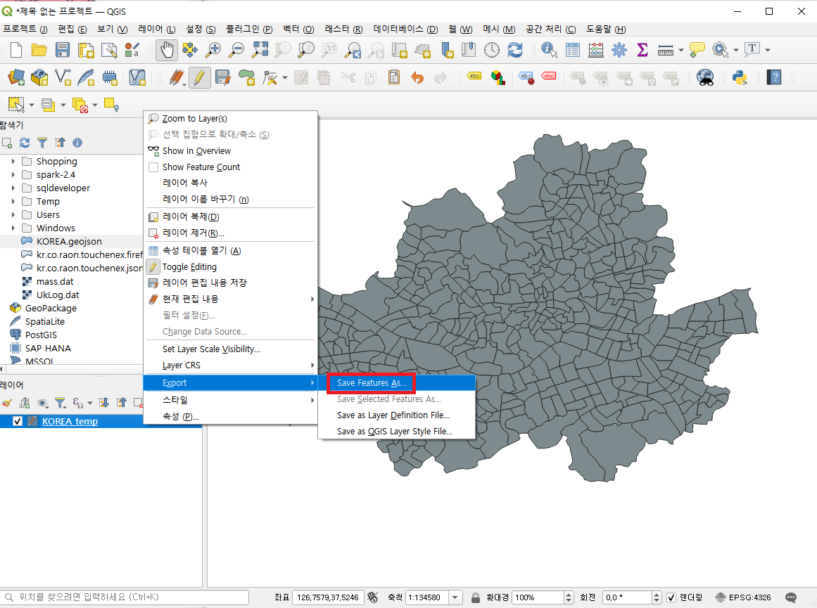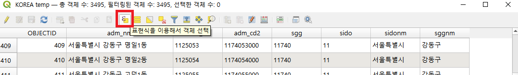 - 객체선택을 누르면 속성 테이블과 캔버스에 서울의 행정동만 선택된것을 볼 수 있습니다. 그 다음 레이어에서 Export를 누르고 Save Features As...클릭합니다