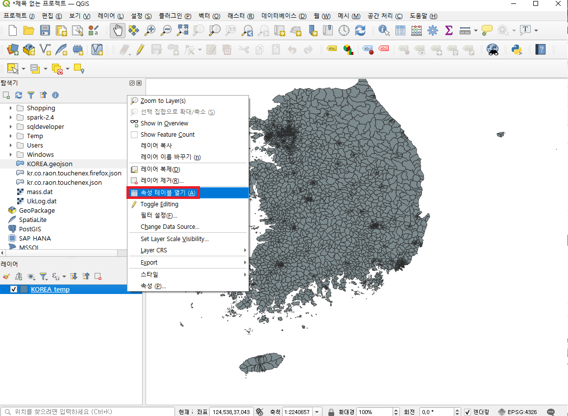 - 레이어에서 파일을 마우스 우클릭하고 속성 테이블 열기를 클릭합니다.