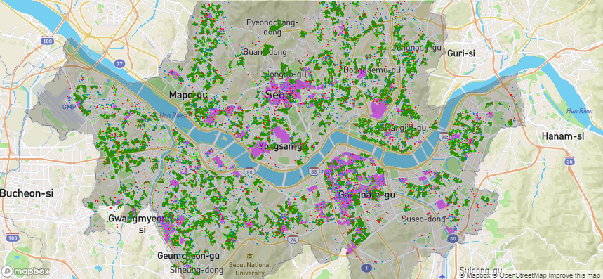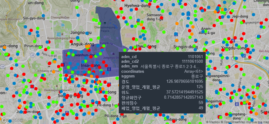 이를 통해서 pydeck으로 상권 영역을 시각화해 보았습니다. 현재 상태로는 골목상권과 발달 상권의 분리가 필요해 보이며 서울시의 행정동 경계가 뚜렷하게 보이지 않아서 PolygonLayer를 하나 더 쌓아햐 할 거 같습니다.