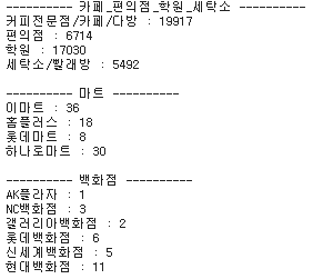 print('세탁소/빨래방', ":", store[store.상권업종소분류명 == '세탁소/빨래방'].shape[0], '\n')