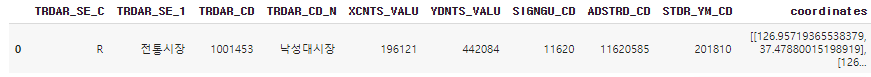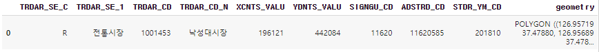 상권 영역에 대한 레이어를 쌓아야 하기 때문에 먼저 geocoding을 하려고 합니다. 데이터를 확인해보면 경곗값과 시군구 코드 그리고 행정동 코드로 변환이 가능해 보이는 것을 확인할 수 있었습니다.