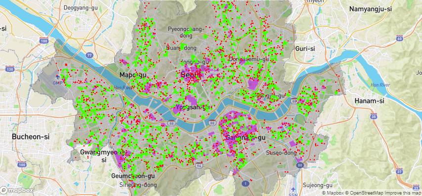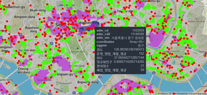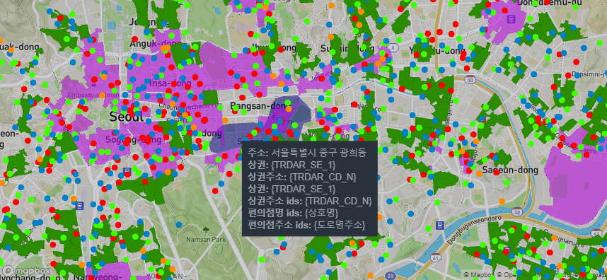 여기서 빨간색은 세븐일레븐을, 초록색은 CU, 파란색은 GS, 주황색은 이마트24를 도시화하였습니다. 또한 각 구역에 어떤 편의점이 분포하였는지 스크롤을 통해서 확인할 수 있었습니다.