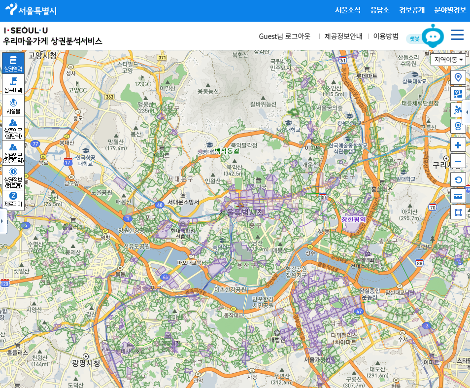 우리마을가게 상권분석서비스를 확인하면 초록색이 골목상권 그리고 보라색이 발달 상권으로 표현되어있습니다. 또한 웹에서는 다양한 데이터를 통해서 반응형 그래프를 확인할 수 있는데 이러한 과정을 머신러닝을 이용한 상권분석 및 상권 추천 시스템과 결과물을 Dash를 이용하여 대시보드로 구현하려고 생각을 하고 있습니다. 이를 위해 현재 추천시스템과 그리고 Dash에 대해서 더 깊이 공부하고 있습니다.