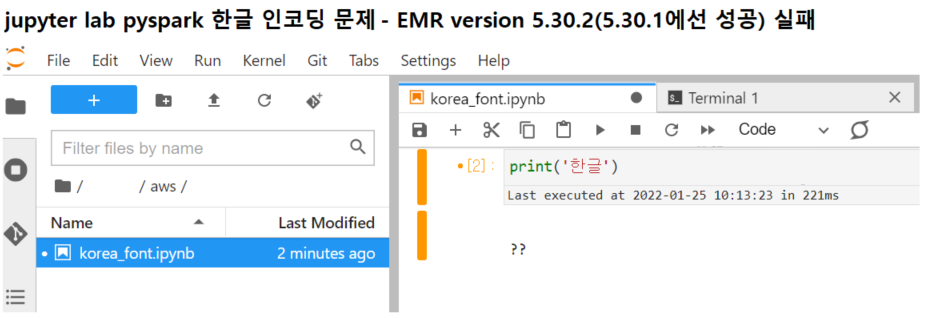 EMR Jupter lab 노트북에서 스파크 커널을 사용할때 한국어 문자가 표시되지 않는 문제가 발생했었다.