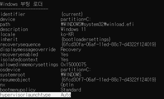 hypervisorlaunchtype이 Auto로 설정되어있기 때문에 다음 명령어로 OFF 바꿔준다.