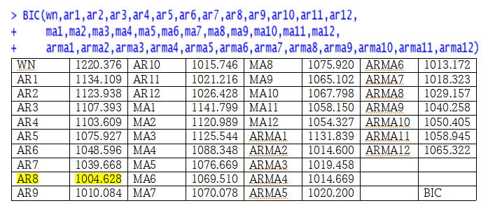 - 백색작음, AR(1)~AR(12), MA(1)~MA(12), ARMA(1)~ARMA(12)의 모형들 중에서 최적의 모형을 찾기위해 각 모형의 AIC와 BIC를 구해보았다.