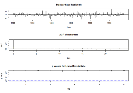 새로 적합된 모형의 잔차들은 자기 상관성을 보이지 않는다