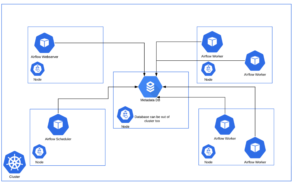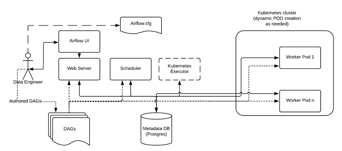 - 쿠버네티스에서 웹 서버, 스케줄러 및 데이터베이스를 실행할 필요는 없지만, KubernetesExecutor를 사용할 때 쿠버네티스에서 다른 서비스들이 함께 실행되는 것이 관리하기 좀 더 수월합니다.