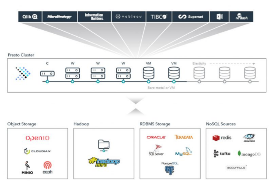 - Presto는 쿼리 전용 엔진이기 때문에 컴퓨팅과 스토리지를 분리하고 다양한 커넥터를 사용하여 다양한 데이터 소스에 연결합니다.