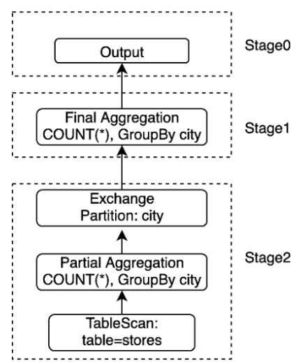 - 리프 단계( Stage2)는 데이터 소스에서 테이블을 읽고 부분적으로 집계된 데이터를 Stage1최종 집계가 발생하는 위치로 공급하며 마지막으로 를 통해 결과를 사용할 수 있습니다 Stage0에 의해 생성된 각 행 은 동일한 도시에 대한 데이터가 의 동일한 작업에 의해 처리되도록 하기 위해 그 안에 있는 열의 Stage2값으로 분할되어야 합니다.