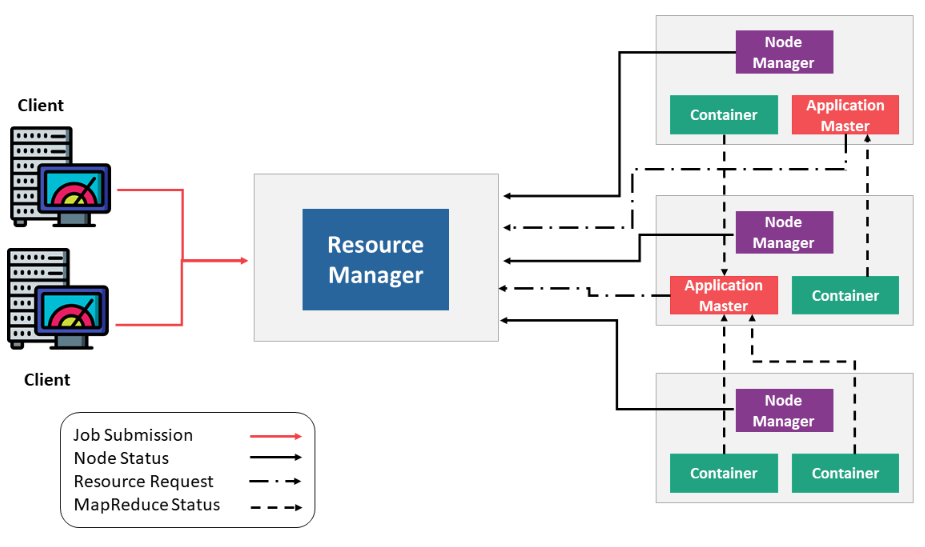 - 애플리케이션 마스터: 개별 애플리케이션의 사용자 작업 수명 주기 및 리소스 요구 사항을 관리합니다. Node Manager와 함께 작동하며 작업 실행을 모니터링합니다.