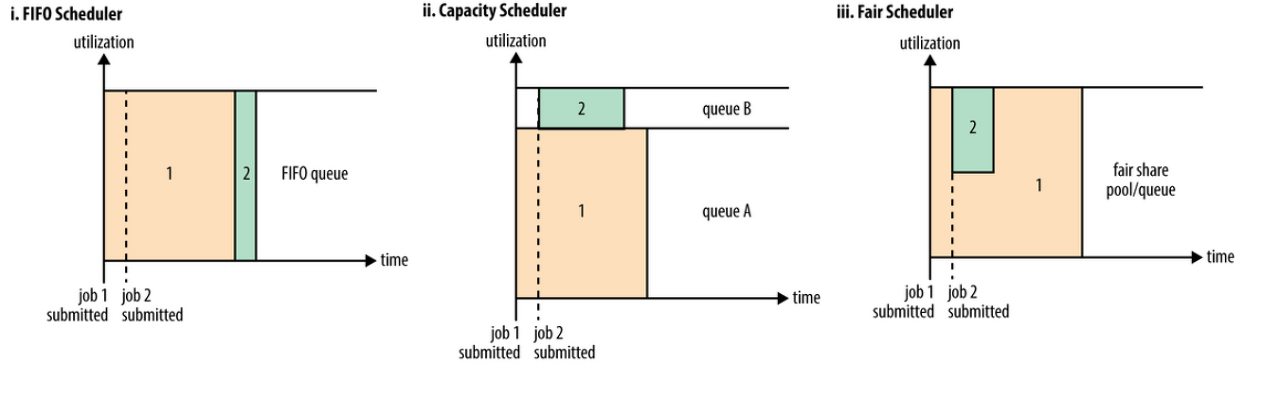 공유 클러스터에서는 Capacity Scheduler 또는 Fair Scheduler를 사용하는 것이 좋습니다. 이 두 가지 모두 장기 실행 작업을 적시에 완료할 수 있도록 하는 동시에 더 작은 임시 쿼리를 동시에 실행하는 사용자가 합리적인 시간 내에 결과를 얻을 수 있도록 합니다.