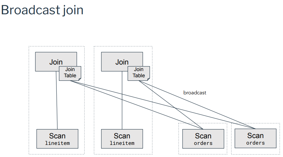 - Broadcast : 쿼리에 참여하는 각 노드는 모든 데이터에서 해시 테이블을 작성합니다.(데이터는 각 노드에 복제됨).