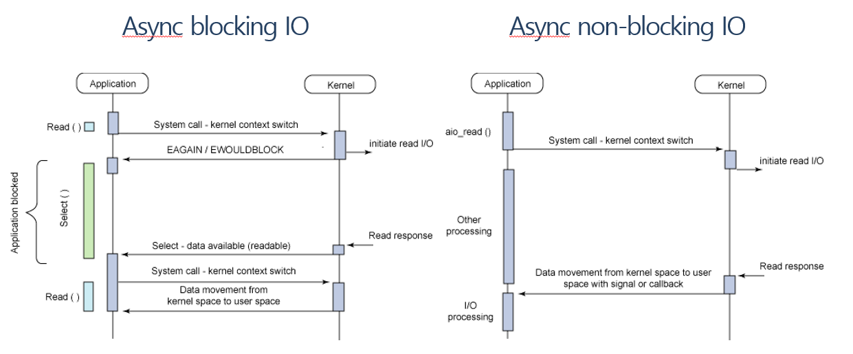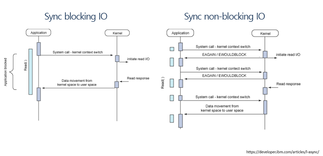 - 일반적으로 프로그램이 I/O 대기(I/O wait, 일시 정지된 상태를 일컬음)에 들어가면, 실행이 멈추고 커널이 I/O 요청과 관련된 저수준 연산을 처리하며(이를 컨테스트 스위칭으로 상당히 비싼 연산), I/O 연산이 끝날 때까지 프로그램은 재개되지 않습니다.