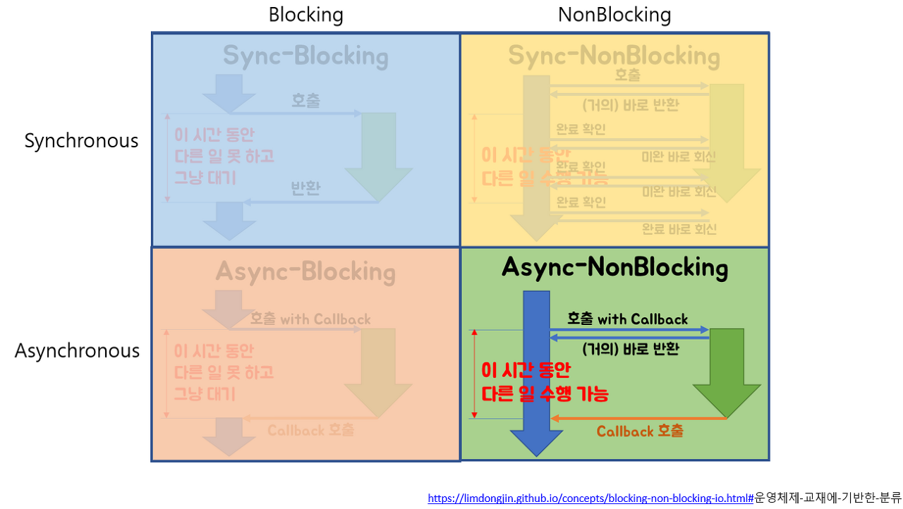 - Async : 코드가 작성된 순서대로 수행하지 않음, IO 작업 완료 여부에 대한 Noty(Notifation)는 커널(호출되는 함수) -> 유저프로세스(호출하는 함수) (작업 되면 연락 주세요 할 거하고 있다가 나중에 연락받음)