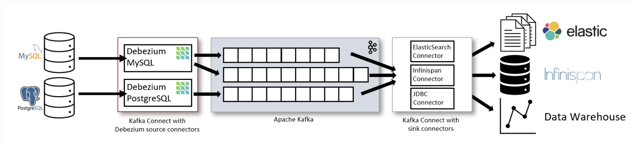 - 데이터를 카프카를 통해 쉽게 스트리밍 할 수 있도록 카프카를 다른 시스템과 연결하는 도구로 커넥터는 MySQL 및 Postgres와 같은 시스템용으로 구축되었으며 CDC 시스템(이진 로그 및 WAL)의 데이터를 카프카 토픽으로 변환합니다.