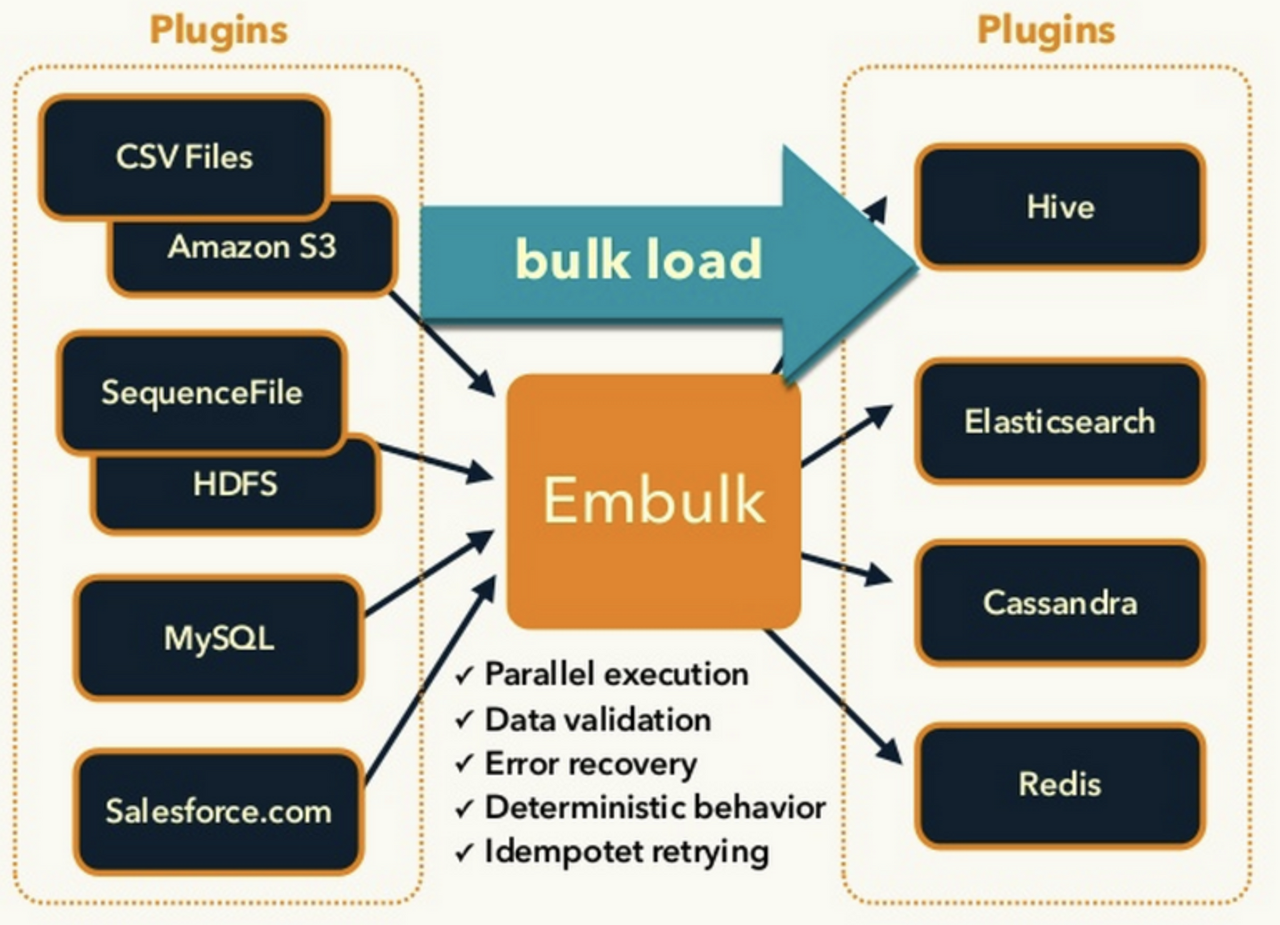 - Embulk는 Fluentd와 같이 Input/Filter/Output 플러그인을 조합해서 설정 파일을 정의합니다. 병렬 분산 처리에 대응한 성능과 재시도 제어 등에 안정성이 우수한 데이터 전송 파이프라인을 만들 수 있습니다.