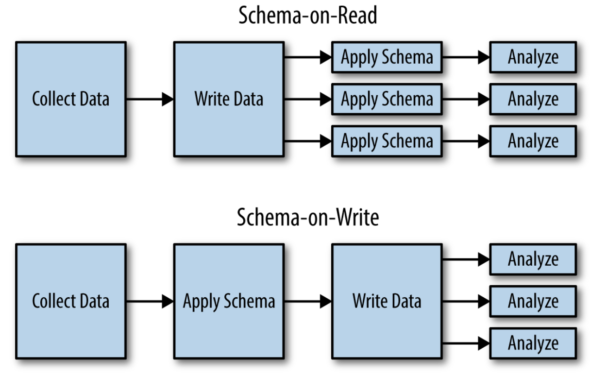 https://www.oreilly.com/content/hadoop-what-you-need-to-know/ - 소스 데이터의 스키마 변경을 처리하는 한 가지 방법은 데이터를 쓸 때 스키마를 정의하는 방식(Schema-on-write)에서 데이터를 읽을 때 스키마를 정의하는 방식(schema-on-read)으로 설계를 이동하는 것입니다.