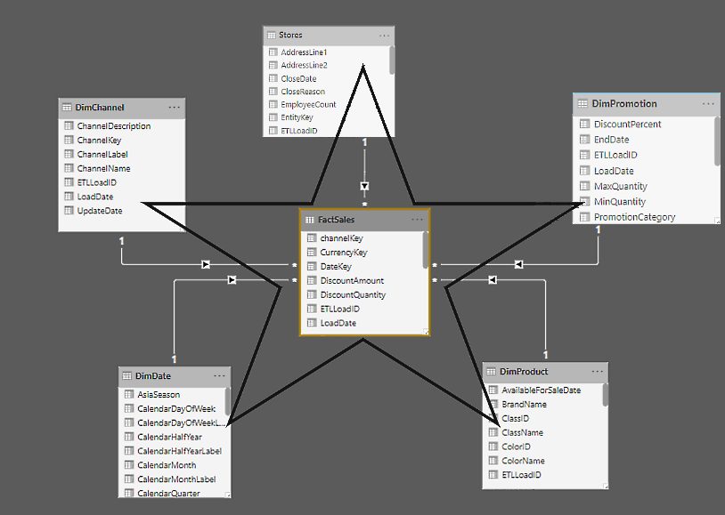 https://www.oreilly.com/library/view/hands-on-business-intelligence/9781838824303/01337b15-338a-4527-8870-32782a65f522.xhtml - 1996년에 발간된 랄프 킴벌, 마기 로스 공저의 The Data Warehouse Toolkit(wiley,2004) 1판에서 처음 소개되었으며 몇 개의 차원과 팩트 테이블 집합으로 구성됩니다. 테이블 관계가 시각화될 때 사실 테이블이 가운데에 있고 차원 테이블로 둘러싸고 있다는 사실에 비롯됐습니다.