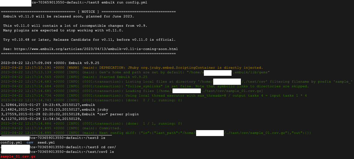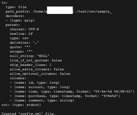 embulk guess ~/test/seed.yml -o config.yml # 입력 플러그인, 출력 플러그인 및 필드 매핑 구성을 포함하는 config.yml 파일을 추측하며 생성