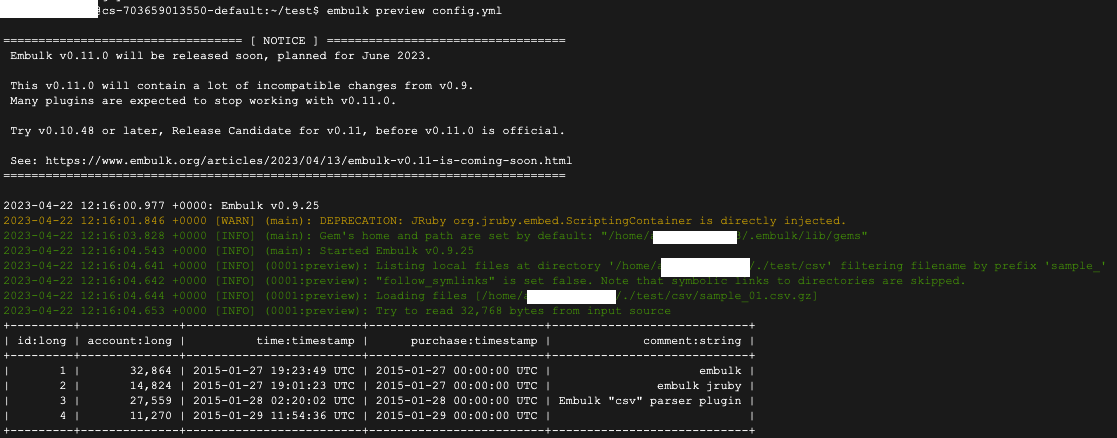 embulk preview config.yml # Embulk를 사용하여 config.yml 처리 결과를 미리보기