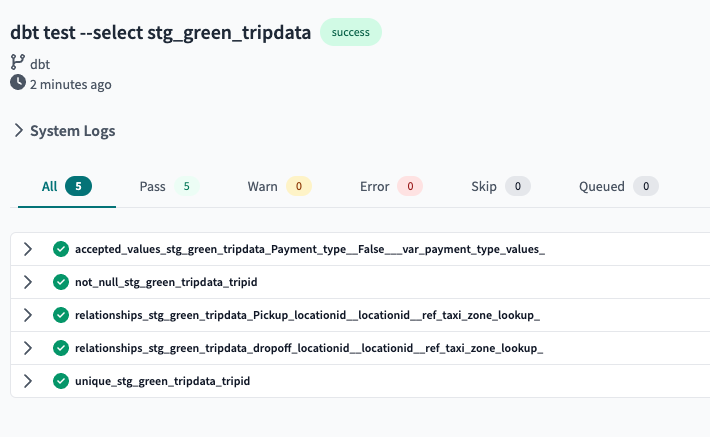 - dbt test는 모델을 실행하기 전에 실행됩니다. 모델의 실행 결과가 올바른지 확인하고, 예상한 결과와 실제 결과가 일치하는지 검증합니다.