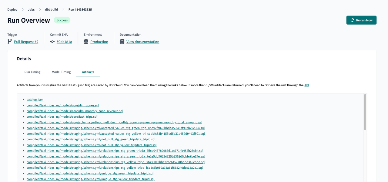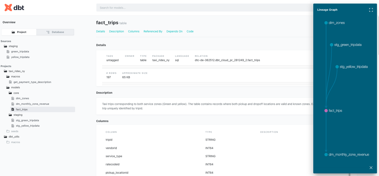 - dbt docs generate 명령어를 실행하면 모델링 코드와 schema.yml 파일을 기반으로 문서화가 생성됩니다.