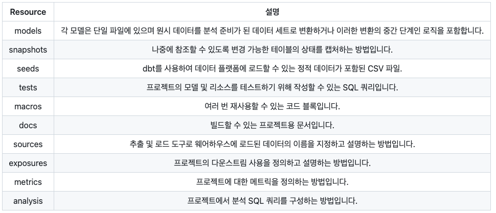 - dbt는 데이터 모델링을 SQL로 정의하고 관리하며, 모델이 실행될 때 데이터를 추출, 가공 및 저장할 수 있도록 도와줍니다.