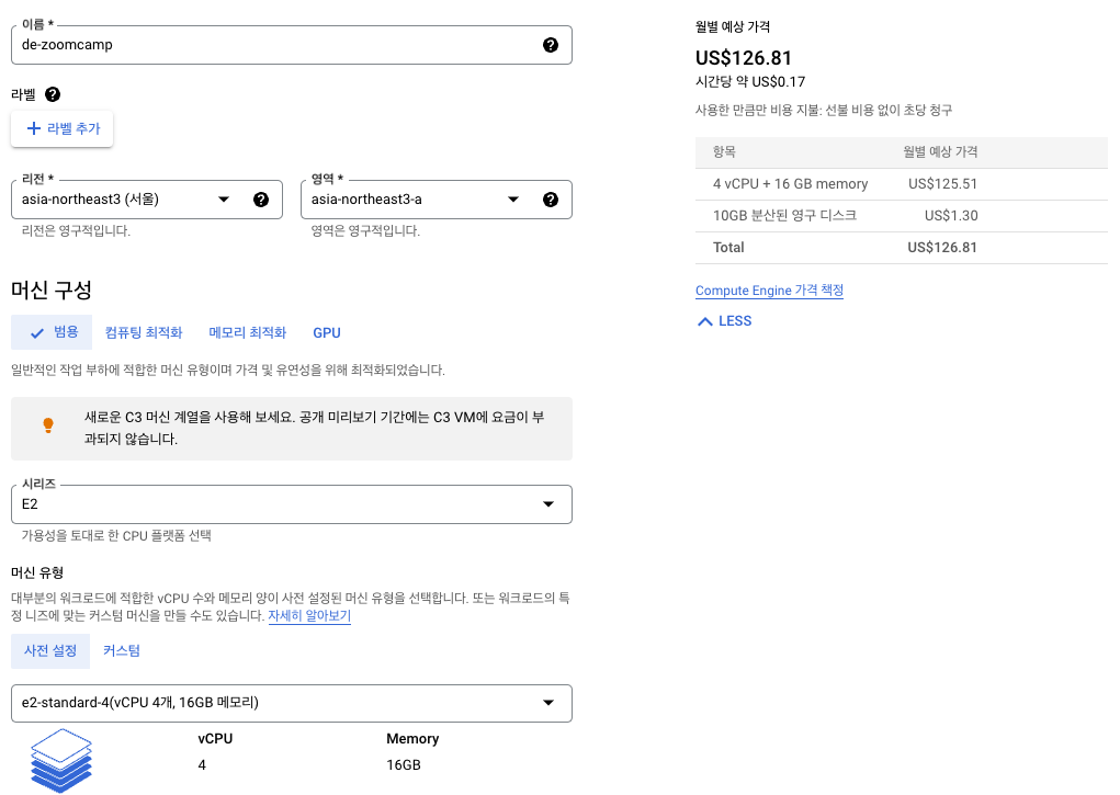 이름과 리전 및 영역을 선택해주고 머신을 e2-standard-4로 선택해줍니다.