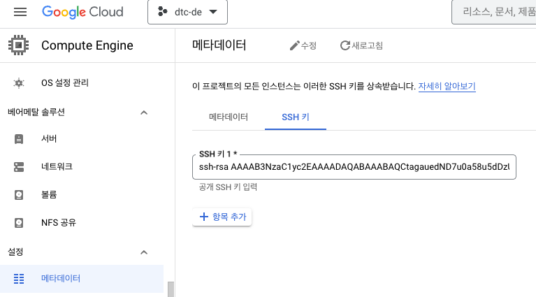 위에서 만든 gcp.pub의 ssh-rsa 코드 키값을 metadata에 추가해줍니다.
